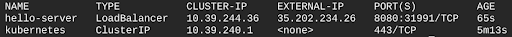 kubectl gethello-server 을 실행 하여 서비스를 검사하십시오 .