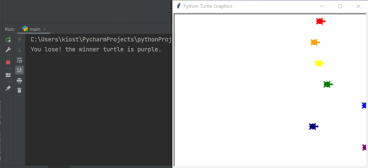 print(f"You lose! the winner turtle is {winner_turtle}.")