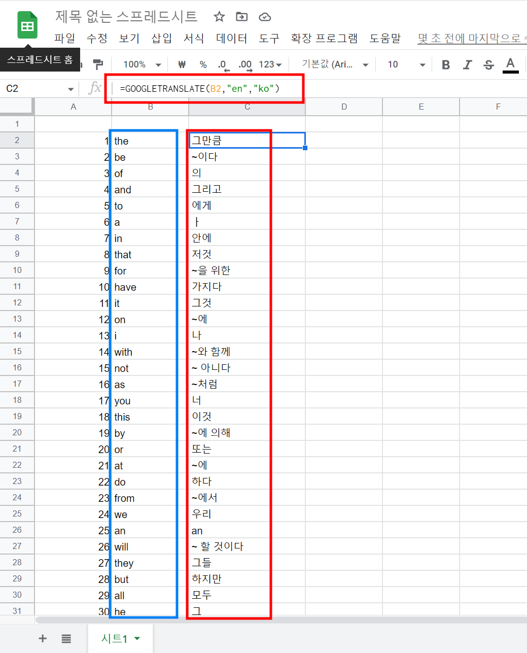 구글 스프레드 시트의 googletranslate 함수를 통해